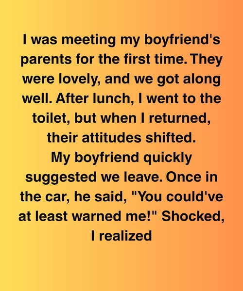 I was meeting my boyfriend’s parents for the first time. They were lovely, and we got along well. After lunch, I went to the toilet, but when I returned, their attitudes shifted. My boyfriend quickly suggested we leave. Once in the car, he said, “You could’ve at least warned me!” Shocked, I realized he was looking at me like I’d betrayed him.