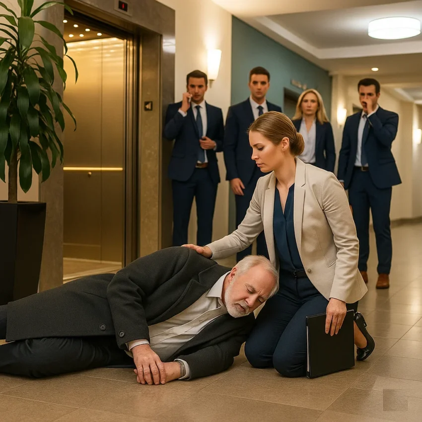 An older man, distinguished with white hair and a neatly tailored overcoat, suddenly staggered near the elevator. Before anyone could react, he collapsed to the floor. Gasps filled the lobby, yet no one moved—only whispering, staring, unsure what to do.