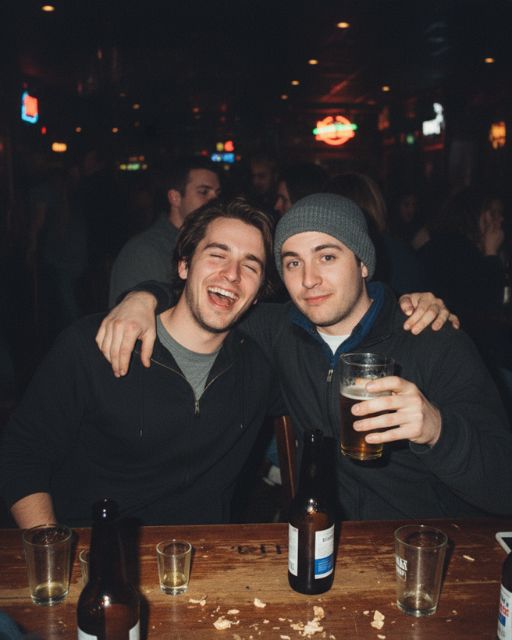 Sitting at a sticky bar table. Smiling. Arm around a guy I’d never seen in my life.