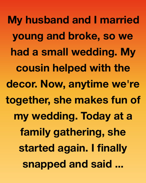 My husband and I married young and broke, so we had a small wedding. My cousin helped with the decor. Now, anytime we’re together, she makes fun of my wedding. Today at a family gathering, she started again. I finally snapped and said, “At least it was built on love, not Instagram likes.”