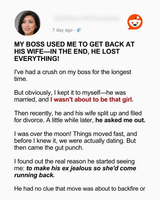 I’ve had a crush on my boss for the longest time. But obviously, I kept it to myself—he was married, and I wasn’t about to be that girl. Then recently, he and his wife split up and filed for divorce. A little while later, he asked me out. I was over the moon! Things moved fast, and before I knew it, we were actually dating. But then came the gut punch. I found out the real reason he started seeing me: to make his ex jealous so she’d come running back. He had no clue that move was about to backfire or…