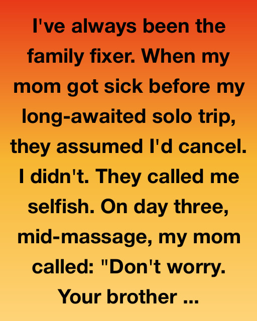 I’ve always been the family fixer. When my mom got sick before my long-awaited solo trip, they assumed I’d cancel. I didn’t. They called me selfish. On day three, mid-massage, my mom called: “Don’t worry. Your brother is taking care of everything.”