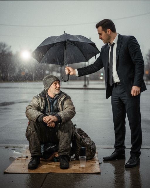 He didn’t rush past like everyone else. He paused. Took off his coat. Held out his umbrella. Covered the man without saying a word.