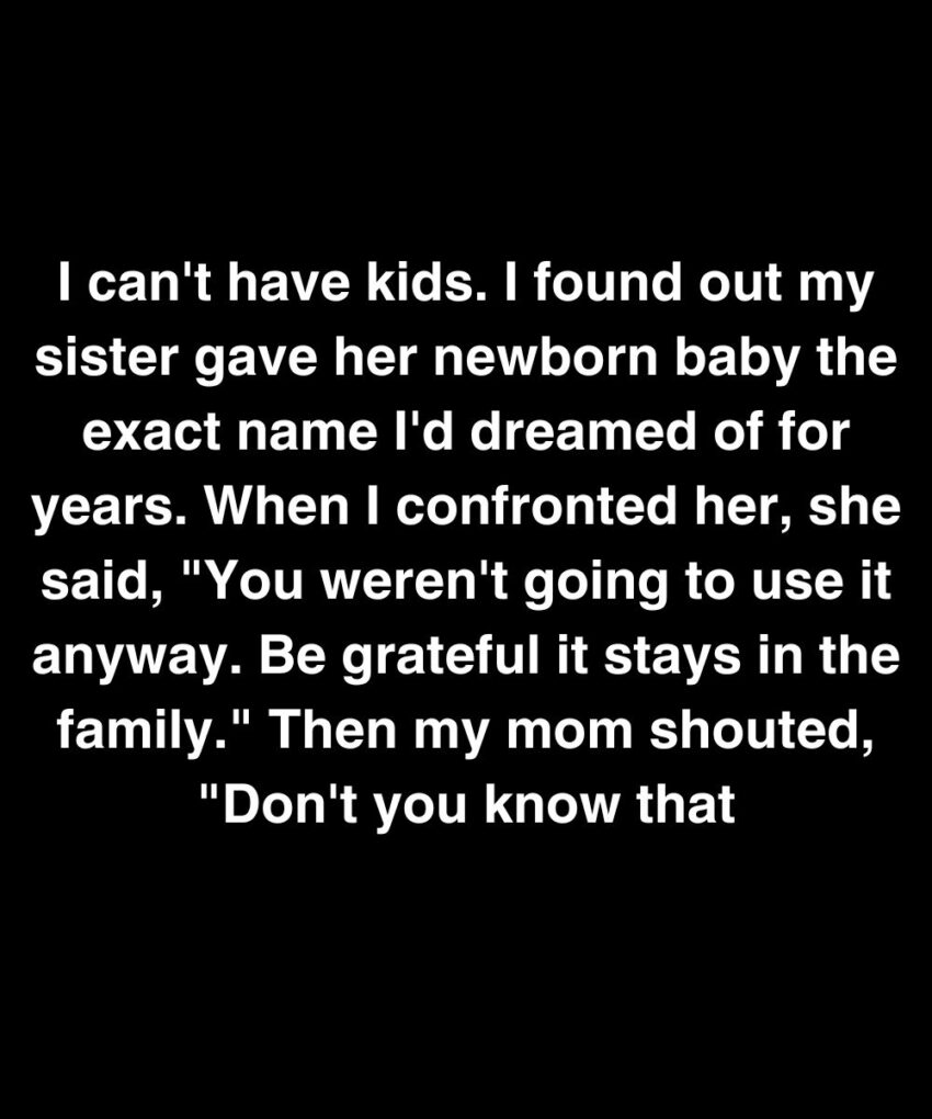 “I can’t have kids. I found out my sister gave her newborn baby the exact name I’d dreamed of for years. When I confronted her, she said, ‘You weren’t going to use it anyway. Be grateful it stays in the family.’ Then my mom shouted, ‘Don’t you know that—’”