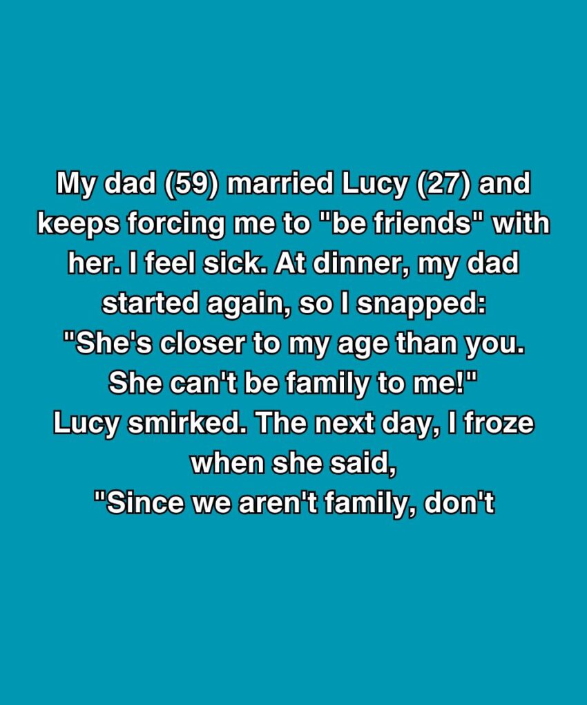 My dad (59) married Lucy (27) and keeps forcing me to “be friends” with her. I feel sick. At dinner, my dad started again, so I snapped:
