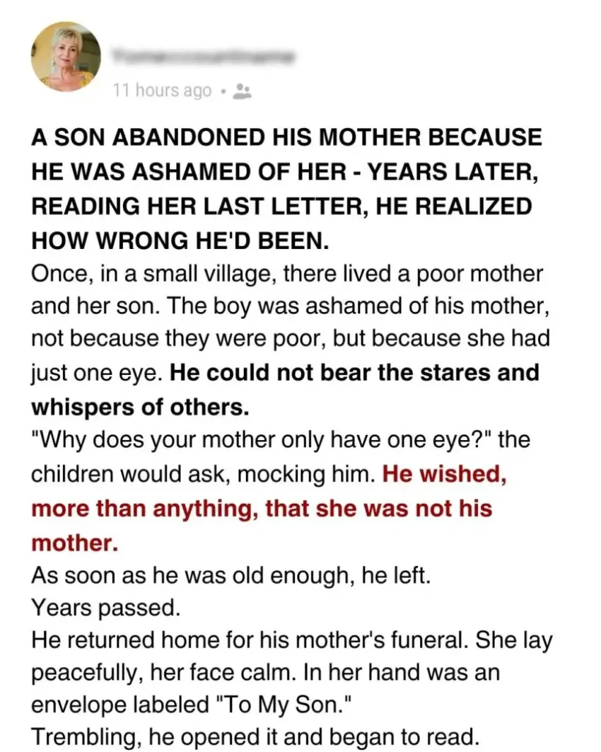 Love wears many faces. In life’s quietest moments, we often realize that our deepest regrets aren’t the words we spoke but the love we failed to see. This is the story of a son who abandoned his mother out of shame, only to return years later and find a letter that brought him to his knees in tears.