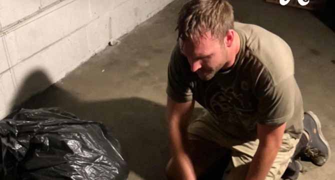 Tom was kneeling on the concrete floor in the center of the basement. He was holding a scrub brush while beads of sweat formed on his head.