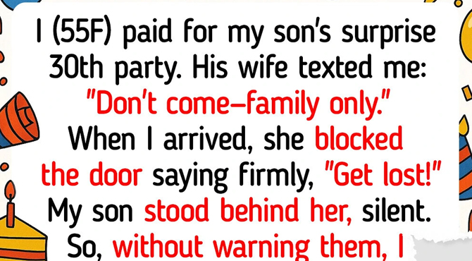 I (55F) paid for my son’s surprise 30th party. His wife texted me: “Don’t come—family only.” When I arrived, she blocked the door, saying firmly, “Get lost!” My son stood behind her, silent.