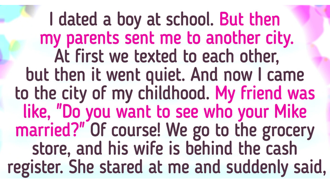I dated a boy at school. But then my parents sent me to another city. At first, we texted to each other, but then it went quiet. And now I came to the city of my childhood. My friend was like, “Do you want to see who your Mike married?” Of course!