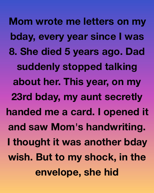 Mom wrote me letters on my bday, every year since I was 8. She died 5 years ago. Dad suddenly stopped talking about her. This year, on my 23rd bday, my aunt secretly handed me a card. I opened it and saw Mom’s handwriting. I thought it was another bday wish. But to my shock, in the envelope, she hid a small, encrypted micro-SD card and a piece of stiff parchment containing a set of latitude and longitude coordinates.