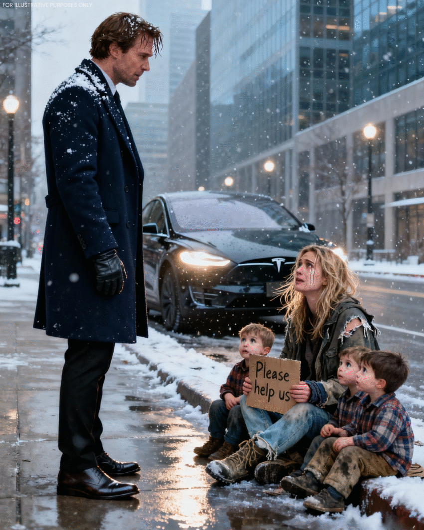 Near the curb, wrapped in a thin blanket, sat a woman with three small children pressed close to her for warmth. The woman held a cardboard sign that read, Please help us. Anything helps. The sight alone was heartbreaking, yet what froze Liam completely was her face.