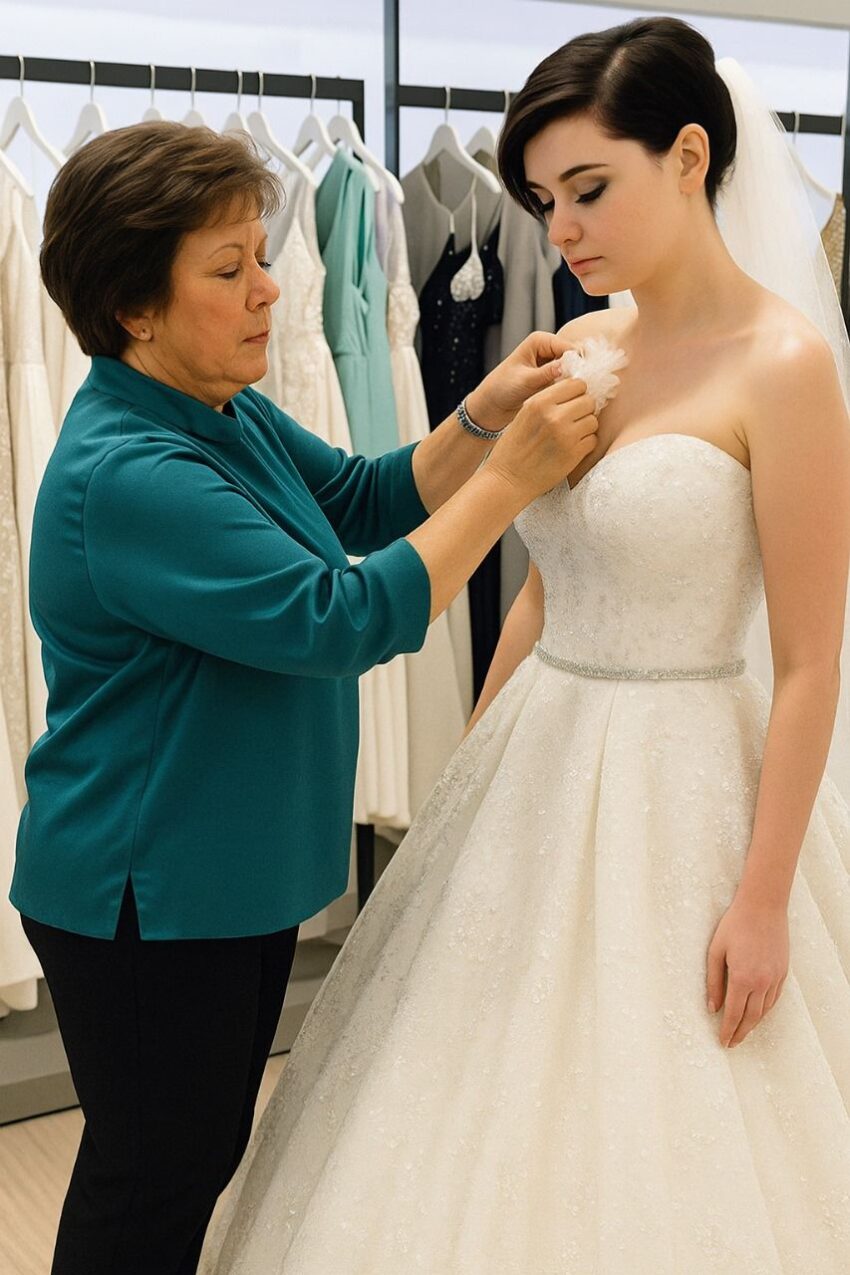 “What about this one?” I asked, twirling in the third dress I tried on. It was everything I had dreamed of — a creamy off-shoulder gown with delicate lace that sparkled gently in the light. The train flowed behind me like something out of a storybook.