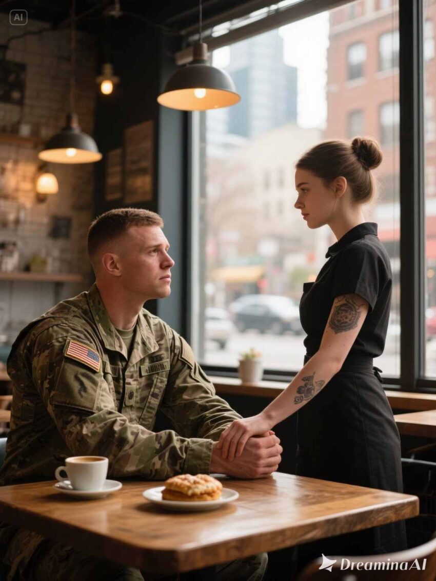 The café grew silent. Lily lowered her gaze. The veteran still held her hand as he said: