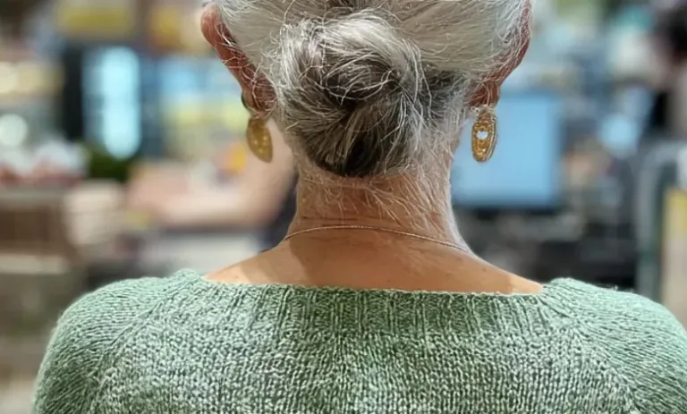 In front of us stood an elderly woman who looked to be in her late 70s. Her hair was pinned back in a soft bun, wisps of silver curling near her ears. She wore a pale green cardigan that looked well-loved, the elbows stretched from years of wear.