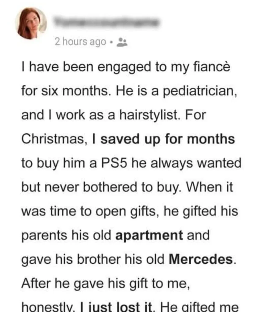 The sting worsened when I noticed the extravagant gifts he had given others — diamond earrings for his sister, a new car for his brother, and even an apartment for his parents. In that moment, I understood it wasn’t a joke — it revealed the lack of respect he had for me.