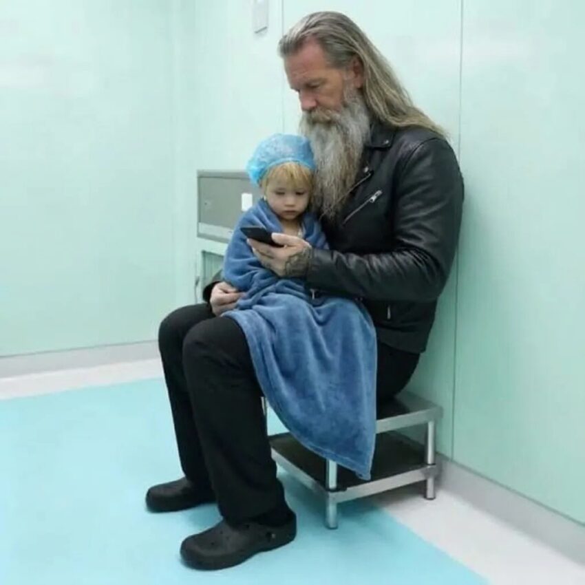 It was then that Liam lifted his head and looked around the room with surprising curiosity. His gaze stopped on a man who seemed wildly out of place in pediatrics—a towering biker in a worn leather vest, heavy boots, tattooed arms, and a beard thick enough to hide half his expression. My first instinct was fear; he looked like the kind of man parents instinctively keep their children away from. But something in Liam softened. His little hand reached toward him, his voice a whisper of wonder. Before I could intervene, the biker noticed and walked over slowly, dropping to one knee so he could look Liam right in the eyes. “Name’s Mike,” he said, his voice gentle in a way that didn’t match his intimidating frame. And suddenly Liam was full of questions—about motorcycles, engines, wind, speed, what it feels like to fly across the road. Mike answered every single one with patience and warmth. Then, unexpectedly, Liam shared something he rarely spoke about—how his dad had always wanted to ride a motorcycle before he passed away. That confession seemed to deepen something between them. And when Liam looked up at me and asked, “Mom… can he hold me?” Mike’s eyes widened, asking silently for permission. I nodded, and my fragile little boy sank into the biker’s arms like he belonged there.