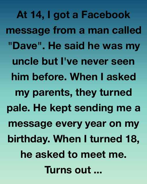 At 14, I got a Facebook message from a man called “Dave”. He said he was my uncle but I’d never seen him before. When I asked my parents, they turned pale. He kept sending me a message every year on my birthday. When I turned 18, he asked to meet me. Turns out he lived just two towns over, worked as a mechanic, and looked a lot like my dad — same eyes, same crooked smile.