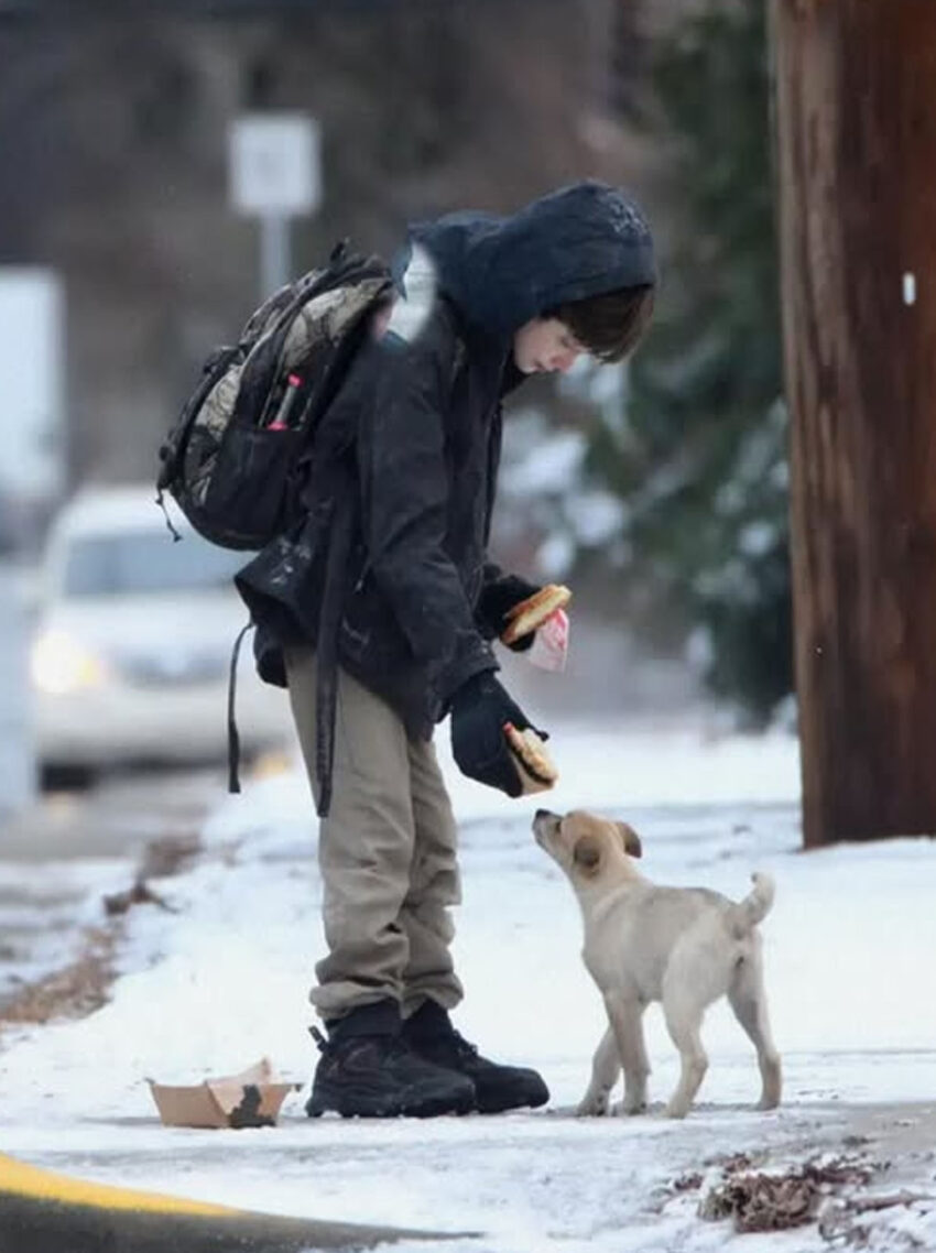 She followed him at a distance, watching as he deviated from his usual route. Instead of heading toward their modest apartment, Eli cut behind an abandoned hardware store, a skeletal building with peeling red paint and a leaning fence. Crouching behind a rusted dumpster, Eli unzipped his backpack and pulled out a sandwich wrapped in wax paper. He didn’t eat it. Instead, he carefully tore it in half and placed a portion on the concrete. From beneath the shadows of the dumpster, a creature emerged that broke Brooke’s heart. It was a scrappy, matted stray dog, its ribs tracing sharp lines beneath its skin, its eyes wide with a mixture of fear and desperate hope. Eli sat cross-legged in the dirt, talking softly to the animal as they shared a meal in the quiet of the alley. “Don’t forget to hydrate,” Eli whispered, sliding a makeshift water bowl made of wax paper toward the dog.