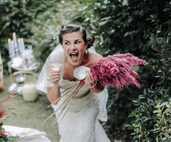 She stood at the end of the long banquet table like she had assembled the entire afternoon specifically as a backdrop for herself. Floor-length white gown with silver threading that caught the light each time she moved. White heels in pasture grass. A tiara that had the specific glint of something that had not come cheap. In one hand a champagne flute, in the other a slow, regal wrist wave she was directing at the assembled guests with the relaxed authority of someone who has been receiving admiration long enough that the receiving has become unconscious.