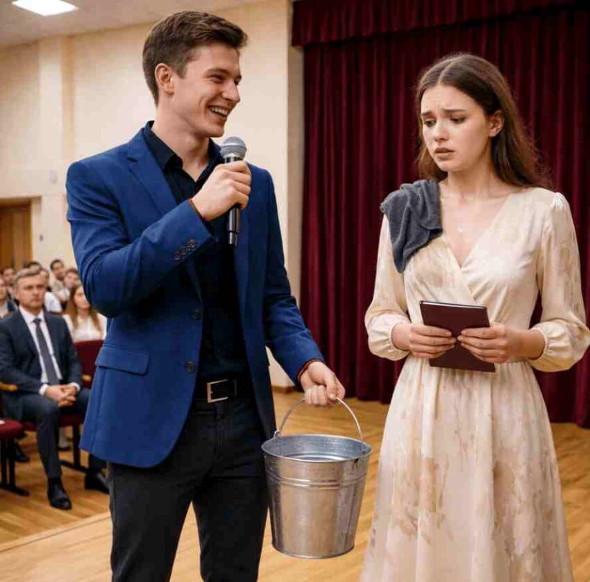 “Pick up the rag—this is your future!” Roman’s voice echoed beneath the high ceiling of the assembly hall, amplified by the microphone. “The janitor’s daughter should know her place. Come down and wipe the floor after yourself!”